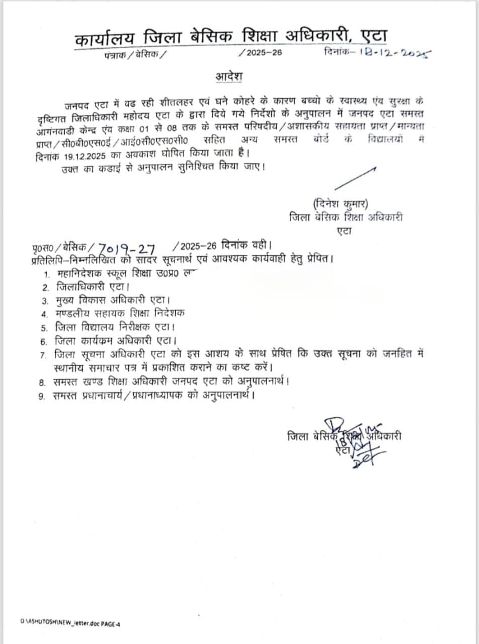 शीतलहर व घने कोहरे के चलते एटा में स्कूल–आंगनवाड़ी बंद, 19 दिसंबर को अवकाश