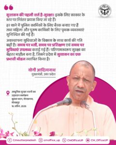 हर थाने में पुलिस कार्मिकों के लिए बैरक बनाए गए हैं तथा महिला और पुरुष कार्मिकों के लिए पृथक व्यवस्थाएं सुनिश्चित की गई हैं।अवस्थापना सुविधाओं के विकास के साथ कार्य की गति बढ़ी है। समय पर भर्ती, समय पर प्रशिक्षण एवं समय पर सुविधाएं उपलब्ध कराई गई हैं। परिणामस्वरूप सुरक्षा का बेहतर माहौल बना है, जिसने प्रदेश में सुशासन का एक प्रभावी मॉडल स्थापित किया है।हम लोगों ने विगत 9 वर्षों में उत्तर प्रदेश पुलिस में 2,19,000+ नौजवानों की भर्ती प्रक्रिया को पूर्ण किया है।प्रदेश में विकसित अवस्थापना सुविधाओं का ही परिणाम है कि वर्तमान में 60,000+ पुलिस कार्मिकों को एक साथ प्रशिक्षण दिया जा रहा है। सुशासन की पहली शर्त है-सुरक्षा। इसके लिए सरकार के स्तर पर निरंतर प्रयास किए जा रहे हैं।हर थाने में पुलिस कार्मिकों के लिए बैरक बनाए गए हैं तथा महिला और पुरुष कार्मिकों के लिए पृथक व्यवस्थाएं सुनिश्चित की गई हैं। अवस्थापना सुविधाओं के विकास के साथ कार्य की गति बढ़ी है। समय पर भर्ती, समय पर प्रशिक्षण एवं समय पर सुविधाएं उपलब्ध कराई गई हैं। परिणामस्वरूप सुरक्षा का बेहतर माहौल बना है, जिसने प्रदेश में सुशासन का एक प्रभावी मॉडल स्थापित किया है।—मुख्यमंत्री योगी आदित्यनाथ जी